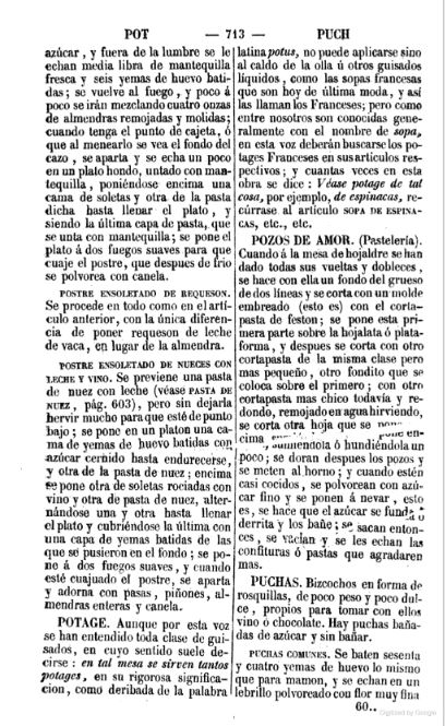 “It contains all the procedures used in high, medium and small kitchens; the normal list of dishes that must make up the different meals, which with a variety of names are made on the day; the method of seasoning the dishes and arranging the different services of a table, and the most select of the arts of the confectioner, the biscuit chef, the confectioner, the distiller and the refrigerator with everything related to confectionery, finding in it all the important articles of the works of this class that have been published in Spanish and other new ones related to both Mexican and French cuisine, the latter taken from the Royal Cook, from the works of Beauvilliers, from the Treatises of Careme, from the Dictionary of Mr. Burnet, from the new economic cuisine and from Other authors.”.