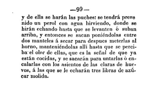 treinta yemas de huevos bien batidas con siete onzas de azucar bien molida y medio real de vino blanco: por separado se batiran las trienta claras,, dejandolas reposar hasta que las quede el asiento con espeso suficiente para poder untar o encalar las puches, luego que esten en disposicion como a continuacion se dire: despues de haber echado el vino a las yemas, se le agregaran siete onzas de manteca y una poca de sal molida, y echandolo en cuatro libras de harina de flor, se batira bien, debiendo quedar la masa muy suelta, y en caso necesario se le echara otra poca mas de harina, sobandola bien hasta que haga ojos dicha masa; y de ella se haran las puches; se tendra preve nido un perol con agua herviendo, donde se hiran echando hasta que se levanten o suban arriba, y entonces se sacan poniendolas entre dos manteles a secar para despues meterlas al horno, mantienendolas alli hasta que se perciba el olor de ellas, que es la senal de que ya estan cocidas, y se sacaran para untarlas o encalarlas con los asientos de las claras de huevos, a las que se le echaran tres libras de azucar molida