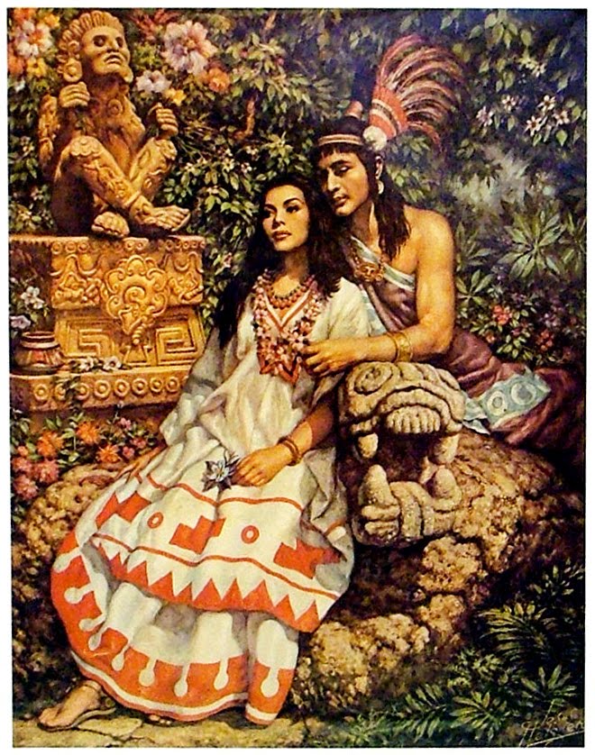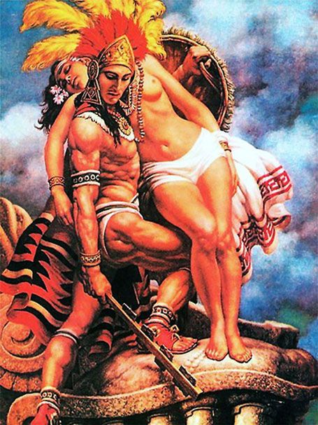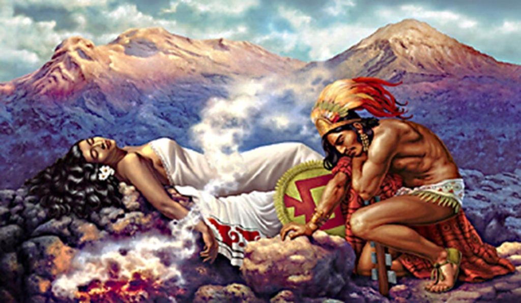 In Aztec mythology, Iztaccíhuatl was a princess who fell in love with one of her father’s warriors, Popocatépetl. The emperor sent Popocatépetl to war in Oaxaca, promising him Iztaccíhuatl as his wife when he returned (which Iztaccíhuatl’s father presumed he would not). Iztaccíhuatl was falsely told that Popocatépetl had died in battle, and believing the news, she died of grief. When Popocatépetl returned to find his love dead, he took her body to a spot outside Tenochtitlan and kneeled by her grave. The gods covered them with snow and changed them into mountains. Iztaccíhuatl’s mountain is called “Sleeping Woman” (from Nahuatl iztāc “sleep” and cihuātl “woman”) because it resembles a woman lying on her back