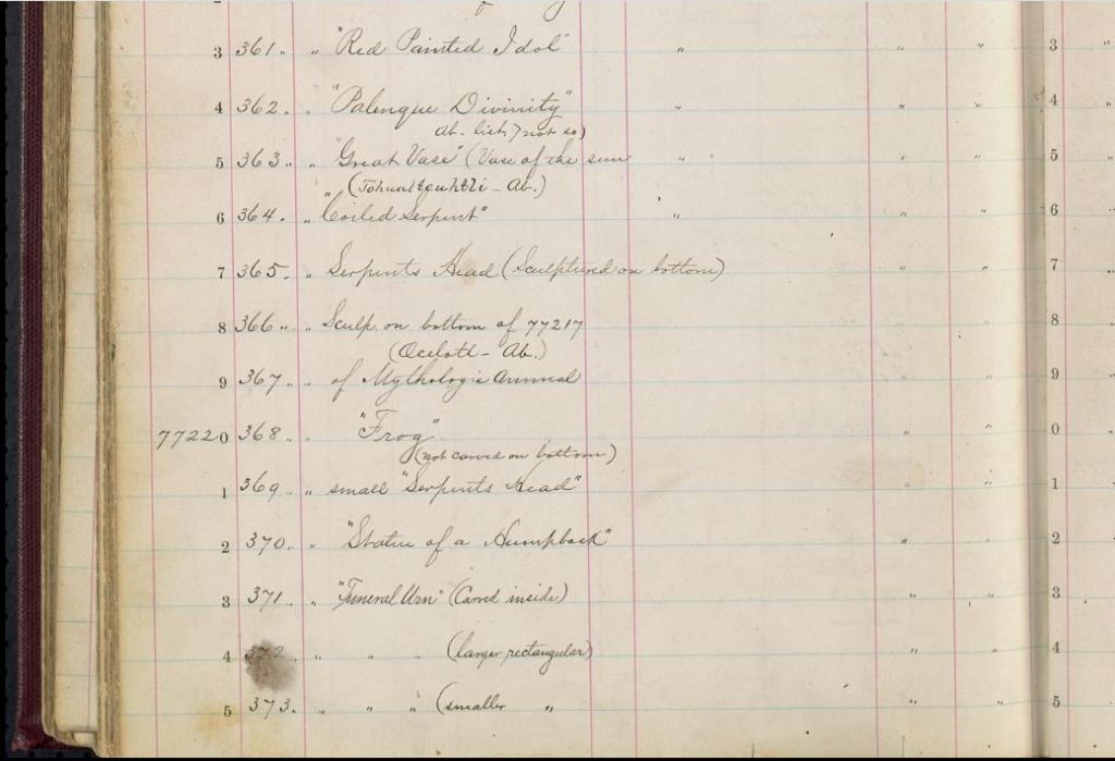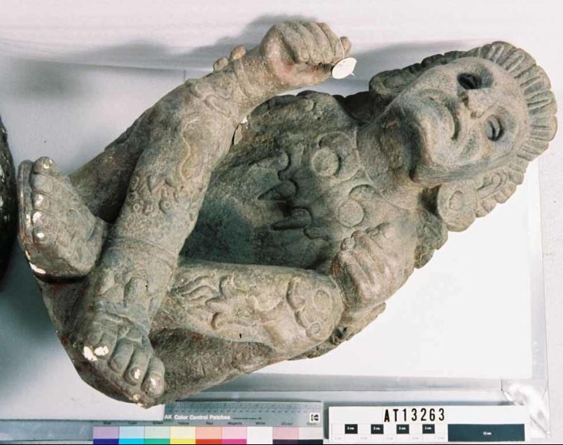 | Notes: (1) | Cast of statue of Xōchipilli, the god of art, games, beauty, dance, flowers, and song in Aztec mythology. His name contains the Nahuatl words xōchitl (“flower”) and pilli (either “prince” or “child”), and hence means “flower prince”. In the mid-19th century, an Aztec statue of Xochipilli was unearthed on the side of the volcano Popocatépetl near Tlalmanalco. The statue is of a single figure seated upon a temple-like base. Both the statue and the base upon which it sits are covered in carvings of sacred flowers (psychotropic plants). The figure himself sits on the base, head tilted up, eyes open, with his mouth half open and his arms open. The original statue is currently housed in the National Museum of Anthropology in Mexico City. |