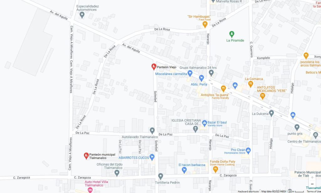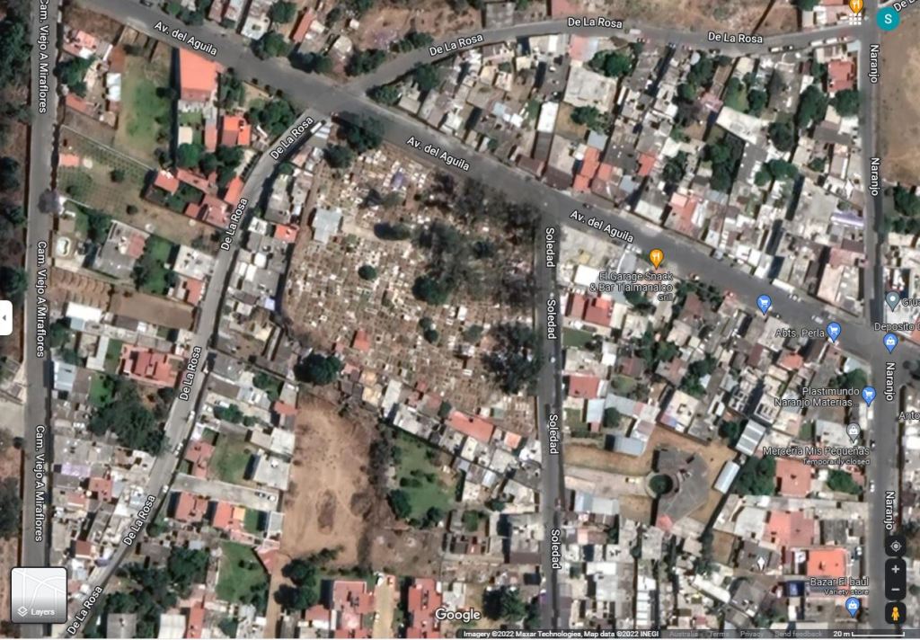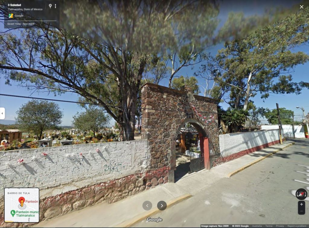 The cemetery is located less than one kilometre from the church and if you compare the postcard shots of the church shown earlier to the maps and images supplied here you can note how urban encroachment has swallowed the entire area. This area is now (again, more or less) an outer suburb of México City and lies only a 52 minute drive (1) from the Zocalo in México City.