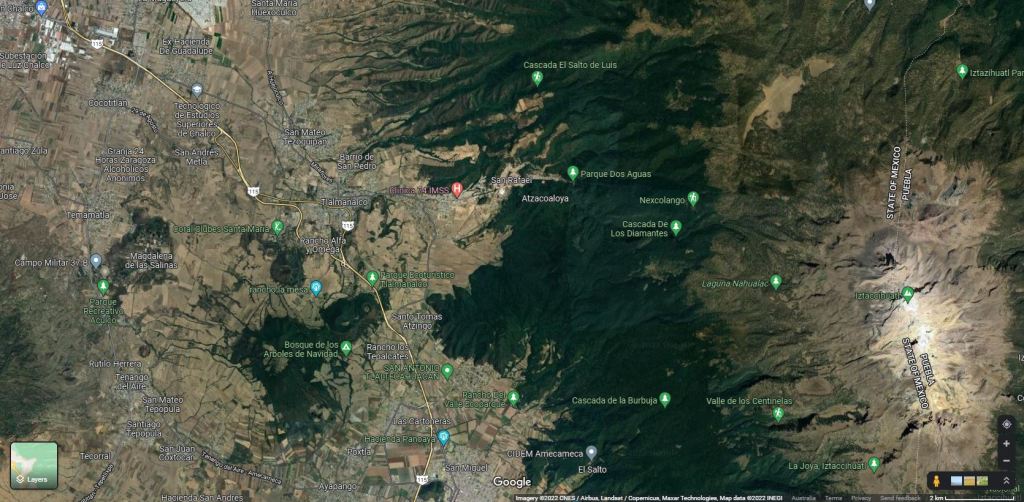 Amecameca lies between Tlalmanalco and Iztaccihuatl.
