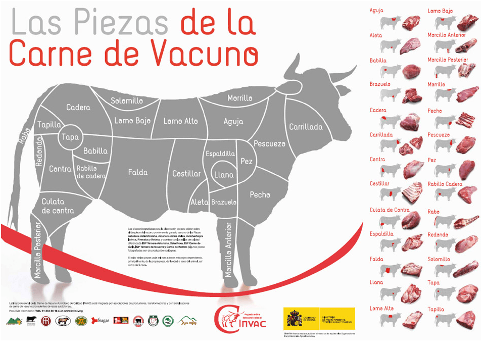 This is directly behind the chuck. Bone-in rib roast is cut from the upper part of the rib section and might be called trozo de rosbif or costillar. Rib eye steaks and boneless rib roasts, are cut from the lower part. Other rib steaks are called costillas chuletas. The lowermost part of the rib yields part of the agujas cortas (short ribs).