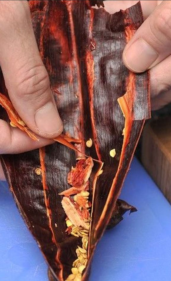 This word comes up often in recipes containing chiles. It means to “remove the veins” of the chile. This can be done to dried, fresh or roasted chiles. Removing the veins (which is the placental tissue of the chile) will remove some of the heat of the chile as capsaicin (the chemical responsible for the heat of the chile) is concentrated in this tissue. You may also see the word “despepitado” (without the seeds) used. So despepitado y desvenado means to remove the veins and seeds of the chile.