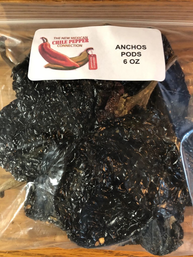 - 3 chiles anchos asados (roasted), despepitados (seeds removed) y remojados (soaked) en agua muy caliente (very hot water)