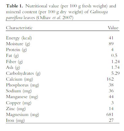 - Zameer, S., Yaqoob, M., Ethnobotanical, phytochemical and pharmacological properties of Galinsoga parviflora (Asteraceae): A review : Tropical Journal of Pharmaceutical Research December 2017; 16 Department of Chemistry, University of Balochistan, Quetta 87300, 2Department of Chemistry, Sardar Bahadur Khan Women’s University, Quetta, Pakistan ISSN: 1596-5996 (print); 1596-9827 (electronic)