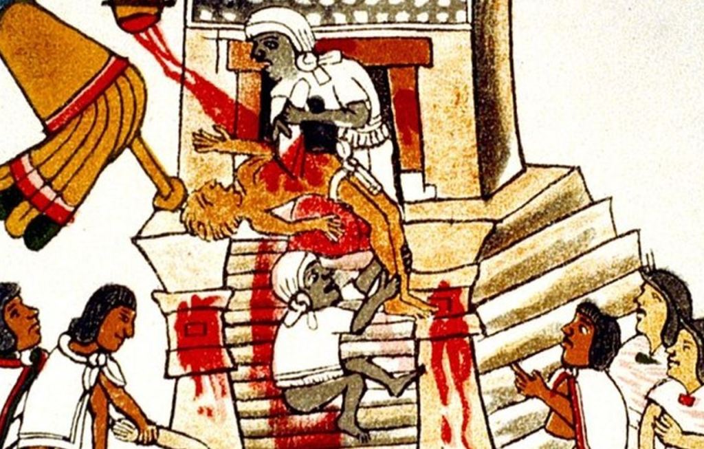 As you can see in the image of the sacrifice above the person being sacrificed by being bent backwards over the sacrificial stone. The tecpatl blade is entering the chest of the sacrifice in exactly the same position as it is placed in the toponym glyph of Ixmiquilpan. (shown above the image of the sacrificial scene)