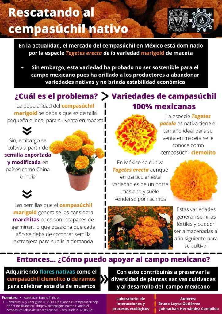 The popularity of the cempasuchil marigold is due to the fact that it is small in size and ideal for sale in a pot. However, it is grown from exported and modified seed in countries such as China and India. The seeds that the cempasuchil marigold generates are considered withered because they are unable to germinate, which means that each year foreign seed must be purchased to meet the demand.