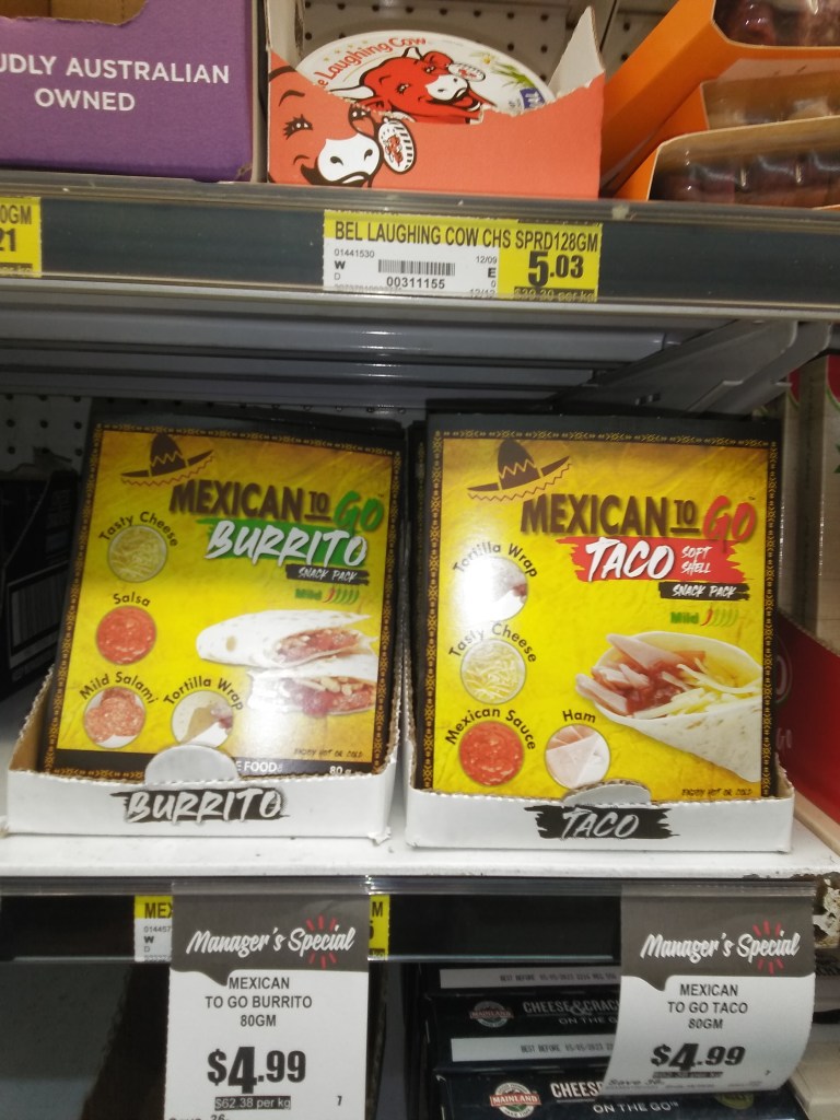 Aside from the tortilla this pack looked much like the munchables I put in my daughters lunchbox throughout her Primary school years. Just swap out the tortilla for some Jatz crackers and away you go. These (the Munchables I mean) were considered to be the height of culinary gastronomy (amongst the 6 – 10 year olds).