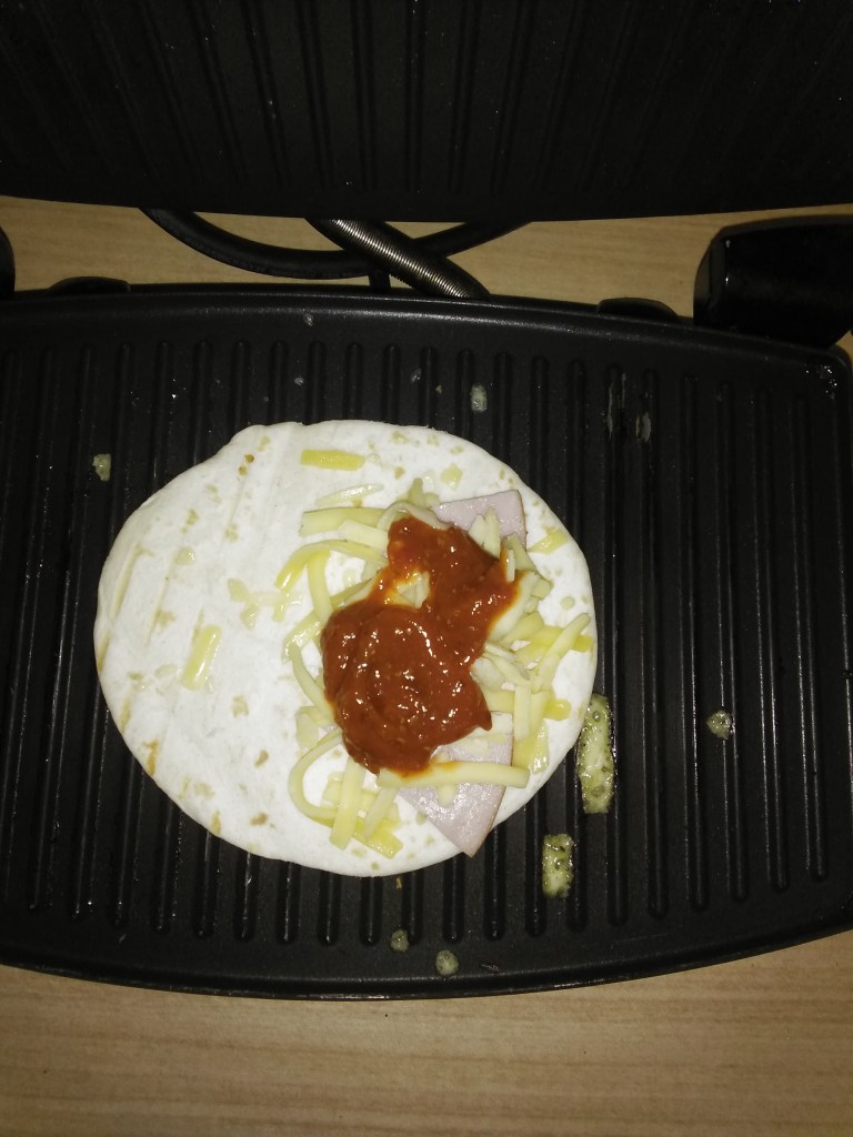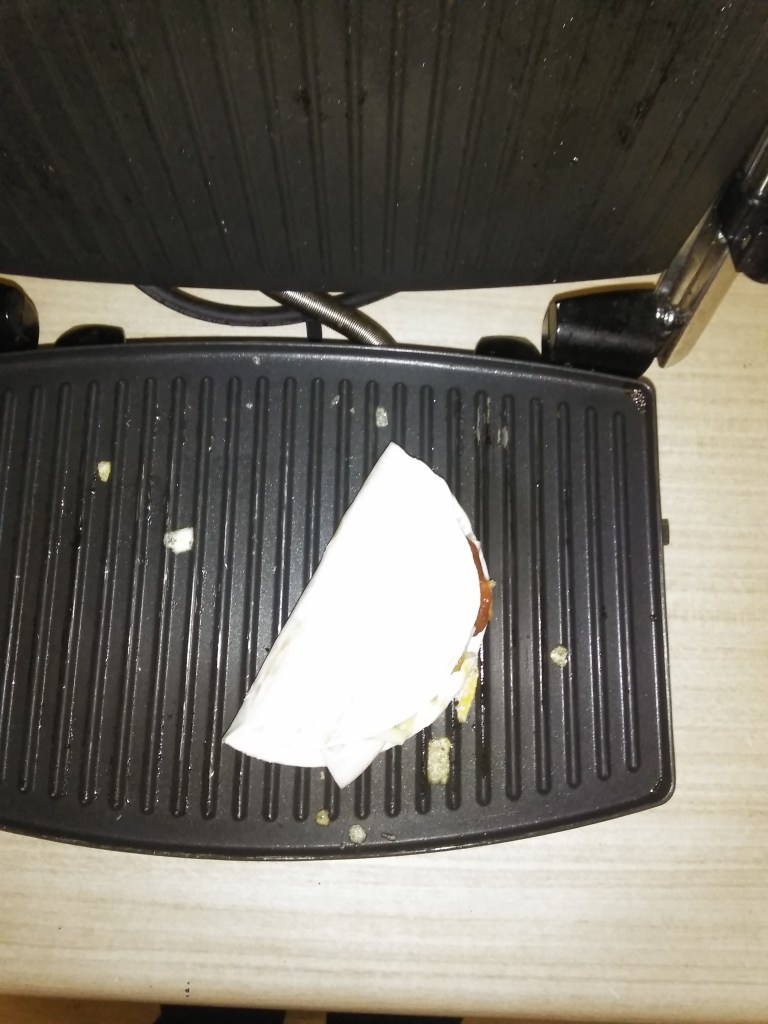 Now lets wander back to the 29% flour tortilla. This sucker was prefolded and rather oily to the touch. It was quite brittle and threatened to snap when I unfolded it. There was no way I was going to be able to refold it without heating it up (and rolling it like a burrito was not going to happen)….so into the sandwich press to warm it into pliability.
