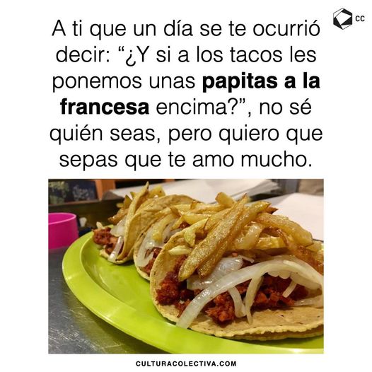 To you that one day it occurred to you to say: And if we put some French fries on top of the tacos? I don’t know who you are, but I want you to know that I love you very much.