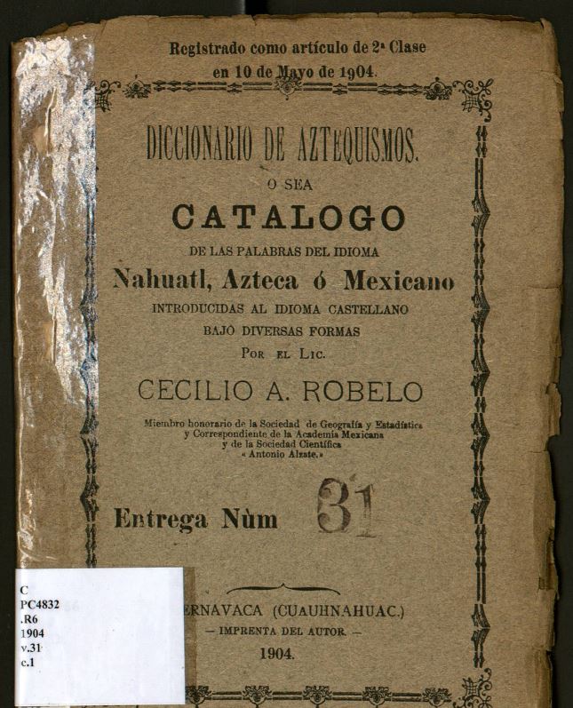 - Robelo, Cecilio Agustin. (1904) Diccionario de Aztequismos. Internet Archive diccionariodeazt00robeuoft