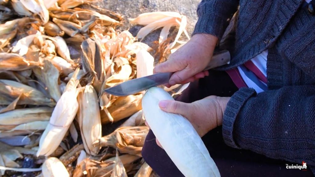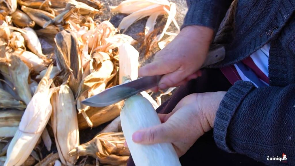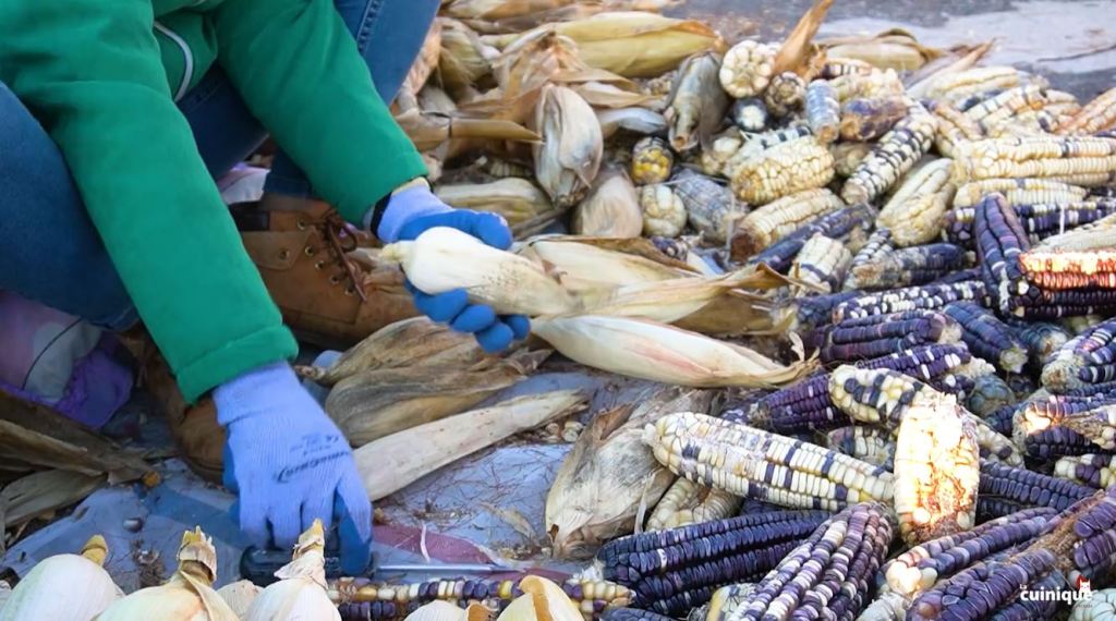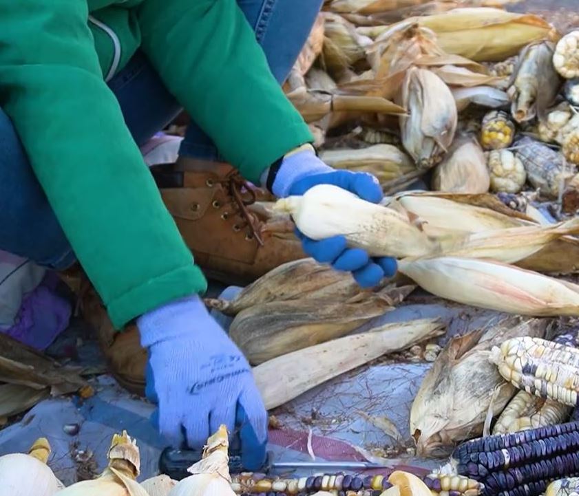 The corn being used has been left on the stalk to dry in the field (milpa). There is a particular way of doing this so that the corn does not rot. Note how the cob has been bent on its stem so it faces the ground. This helps prevent water from gathering in the cob and causing it to go mouldy and rot.