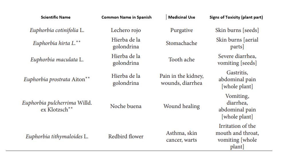 This species (Euphorbiaceae) can be fairly toxic so care is advised when using it and its use should be directed by someone trained in its use. Its use is not advised during pregnancy or breastfeeding. The sap of the plant is toxic and there are issues with some varieties looking similar to edible herbs (1). I once again reiterate If you are not 100% sure of a plants identity then DO NOT USE IT!. 100% sure is the equivalent of knowing the difference between milk and orange juice when you visit your refrigerador