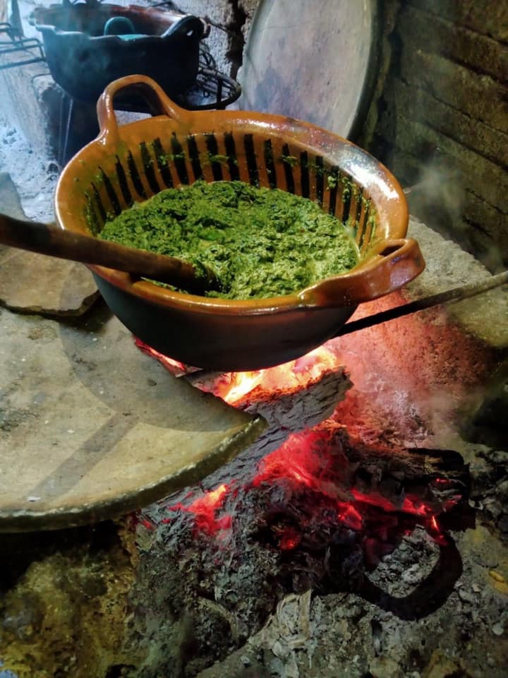 Add the pine nut – chile paste to the cooking paxnikaka leaves