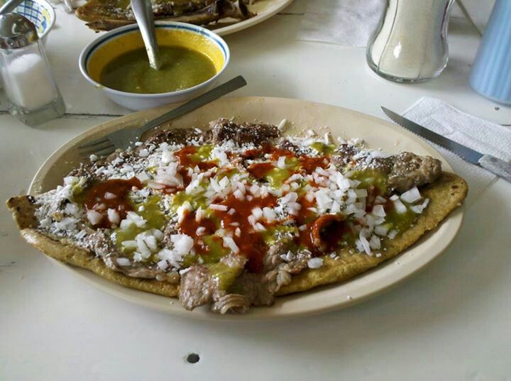 The Martajada (or huarache toluqueño) from the neighbourhood of La Teresona in the city of Toluca is made from maíz martajado azul or crushed blue corn (and of course covered with frijoles, cilantro, nopales, onion, queso fresco and salsa roja de chile árbol o guajillo). It was said to have been created for the hungry patrons for the pulquerias that lay on the outskirts of town. These soon made their way to the CDMX and can still be found today in Chapultepec and the city centre.