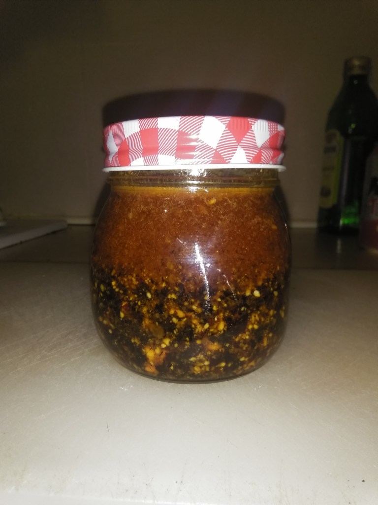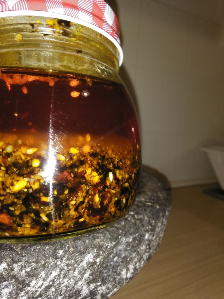 The oil has settled and cleared. The flavours are much richer and I have been eating it a lot (with chicken mostly…and it took my tuna sandwich to the next level). It does seem quite oily so next time I double my chiles in the recipe.