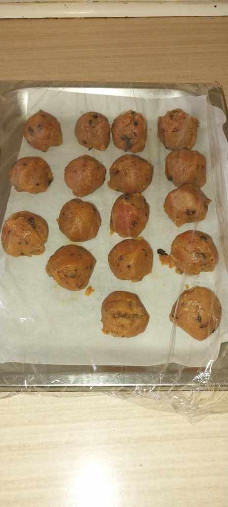 - Step 5: Use a tablespoon or half-ounce ice cream scoop to portion the dough (each will weigh about 25 grams) onto the pan. This is just for storage so there’s no need to space them out. Wrap and chill at least 2 hours or ideally overnight.