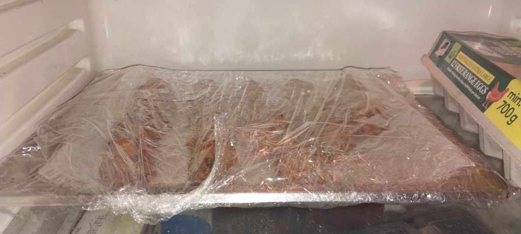 Step 5. Cover and refrigerate for at least a few hours. I left mine in the fridge overnight. This hardens up the dough and prevents it from spreading out too much when cooked (I assume)