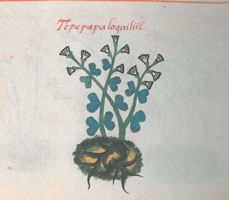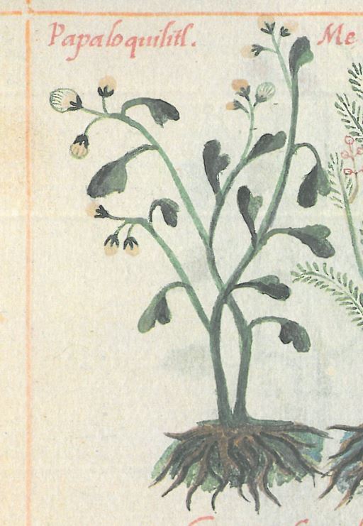 The first written references to papaloquelite (papaloquilitl) appear in the Libellus de Medicinalibus Indorum Herbis (“Little Book of the Medicinal Herbs of the Indians”) or more commonly the Codex de la Cruz-Badiano (Badianus Manuscript) . This text was written by Martín de la Cruz in the Colegio de Santa Cruz de Tlatelolco (1) in 1552 and then translated into Latin by Juan Badiano. The book is also called the Codex Barberini after Cardinal Francesco Barberini, who had possession of the manuscript in the early 17th century. It is the first illustrated and descriptive scientific text of Nahua medicine and botany produced in the Americas. It is a significant text in the history of botany and the history of medicine. In the year 2000AD William Gates published “An Aztec Herbal: The Classic Codex of 1552” which was an English translation of the Libellus de Medicinalibus Indorum Herbis as published by the Maya Society in 1939.