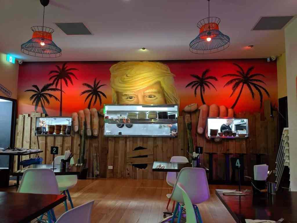 The restaurant above even has a loop of various clips from Donald Trumps speeches running on a loop in the bathrooms. They take clips of some of his most offensive quotes which I assume they think are amusing but in reality they are totally missing the boat on this one. Do better.