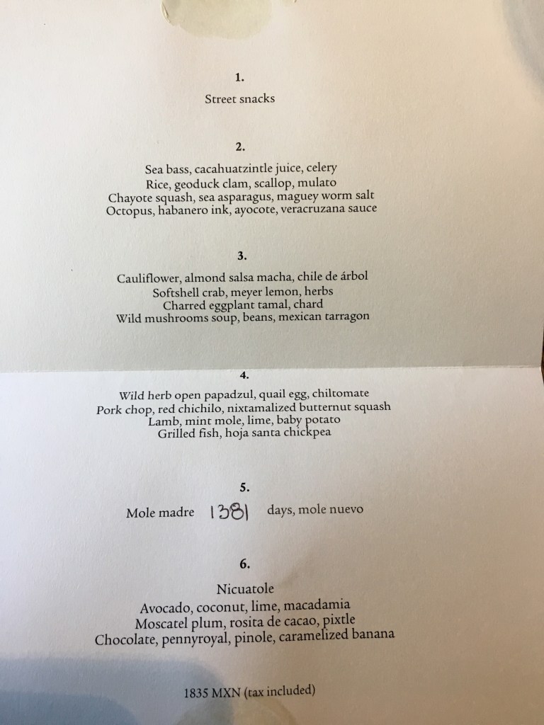An example of a Pujol menu. Note the age (1381 days) of the mole madre (mother mole). Enrique created a mole which is reheated every day (much like a Chinese Master Stock) and the newly created mole of the day is added to a portion of the mole madre and, as you can see in the image above, the mole is served alone (as it is the hero) with only tortillas to scoop it up. This truly shows the personality of both moles (the madre and the newly created) without the interference of other ingredients. At current exchange rates (November 2023) this meal costing 1835 pesos is the equivalent of about $165 Australian. This price is certainly out of my general reach and I could only eat here on a special occasion at this price (this is also not a really expensive meal at Pujol). Has Enrique “gentified” Mexican food?