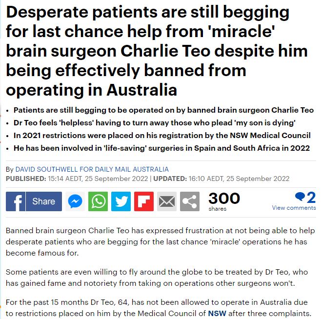Doctors themselves are not safe from their own system of governing. As a couple of examples… Dr Teo is an Australian neurosurgeon that will take on brain surgeries that are deemed by his compatriots as impossible and inoperable. By and large he is successful in his endeavours (and that is part of the problem). The medical establishment has reacted by preventing him from saving lives……Dr Kerryn Phelps is a previous president of the Australian Medical Assoc (AMA) and was a fervid proponent of the covid vaccine roll out. She publicly spoke up for and pushed for mandatory vaccination. After she received her 2nd vaccination and after her partner was crippled by her vaccination she started to investigate and query (rather that just regurgitate the party line) and she has been ostracised by the medical fraternity in Australia. No one is safe from the money-makers who control these systems.