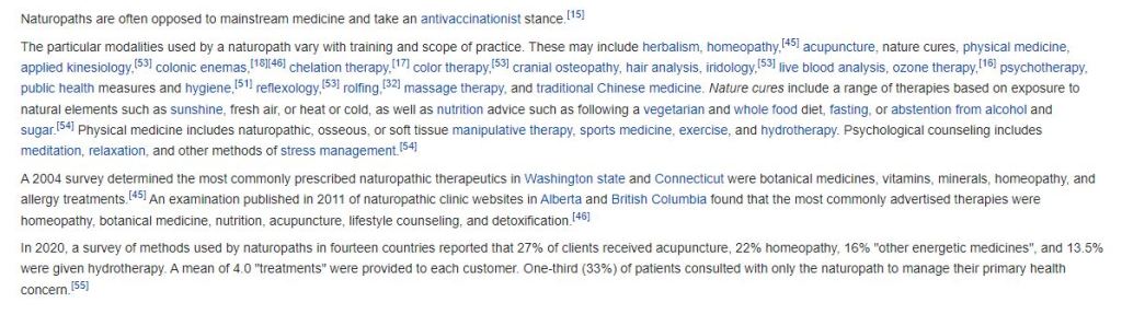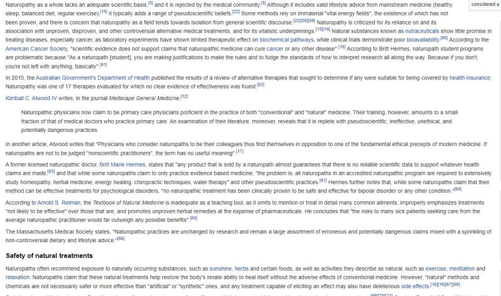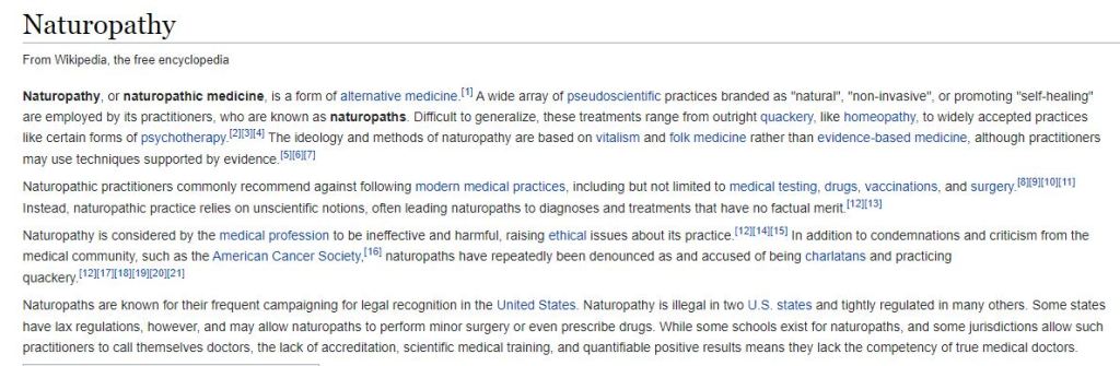 When searching for information about naturopathy (online) the first definition that often comes up is a Wikipedia entry (2nd choice in this case) and all I have to say is what a crock of shit. The effort that has gone into this page with the sole purpose of denigrating and completely misrepresenting naturopathy is breath-taking.