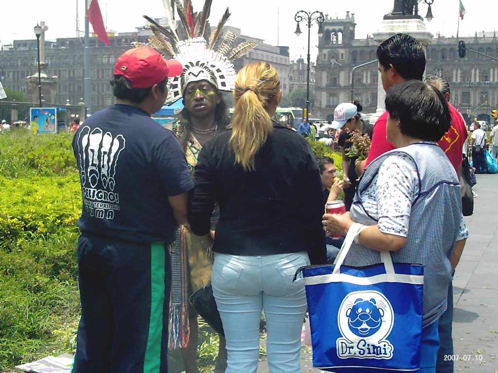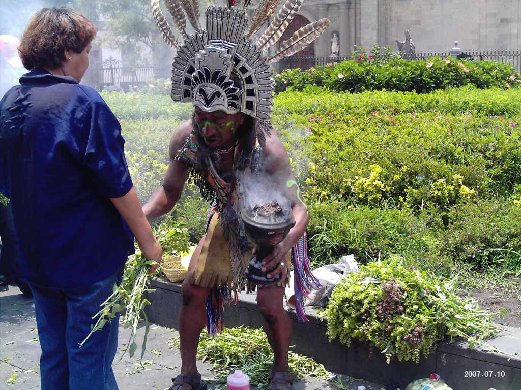 A curandero performing limpias for the public near the Metropolitan Cathedral just off the Zocalo in México City.