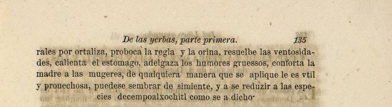 The one they call cococaquilitl, is a herb that produces the leaves of basil, but more deeply asserted, and as if full of sinuses, painted with little yellow spots, each one has three stems, each with six corners, the flowers like betonica, or wild cempoalxochitl, whose leaves are scarlet in color, the flowers produced from certain squarish vessels, not similar to those of the cyamo, the roots are like strands, and the plant is usually three cubits long, the flowers and leaves are Odoriferous and with a sharp flavor and that in some ways resemble that of the butterflies, they are eaten by natu- (next page) -rale (natural) for vegetables, causes menstruation and urine, resolves wind, warms the stomach, thins the thick humors, comforts the mother (the womb of?) to women, in any way it is applied it is vital and beneficial, it can be sown seed, and will be reduced to the species of cempoalxochitl as mentioned above.
