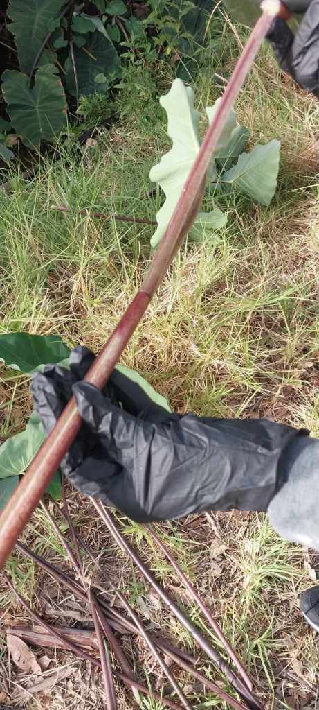 They were harvesting the plant to eat its leaf stems (petioles) rather than the leaves themselves. Both were wearing latex gloves as they said the sap of the plant can make you very itchy. See the WARNINGS as noted in my Post Quelite : Mafafa.