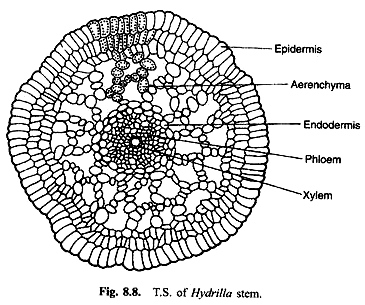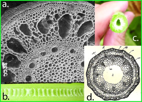 The centre of the stalk is comprised of a porous, web-like tissue that is spongy, airy, and firm. This structure is known as aerenchyma, a soft plant tissue. Aerenchyma is primarily found in aquatic and wetland plants. Aerenchyma is a modified parenchyma (1), where the cells are arranged with regular air chambers in between to facilitate diffusion of gases in and out. They also provide buoyancy to hydrophytes (2) like lotus and water hyacinth that help them float on water.