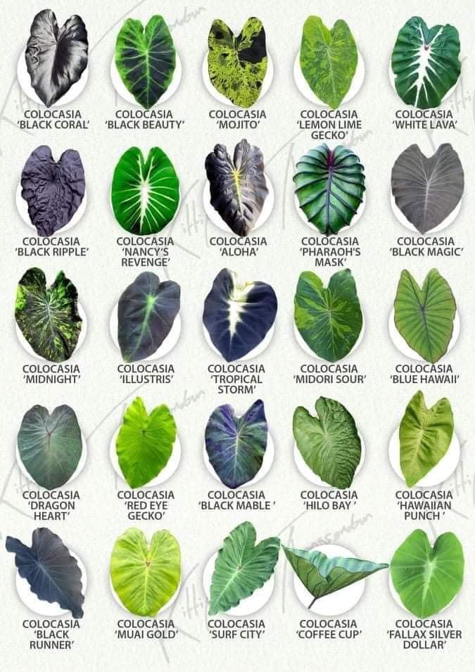- Colocasia varieties via AAL Gardening on Facebook : https://www.facebook.com/photo/?fbid=362471801953140&set=pcb.362471935286460