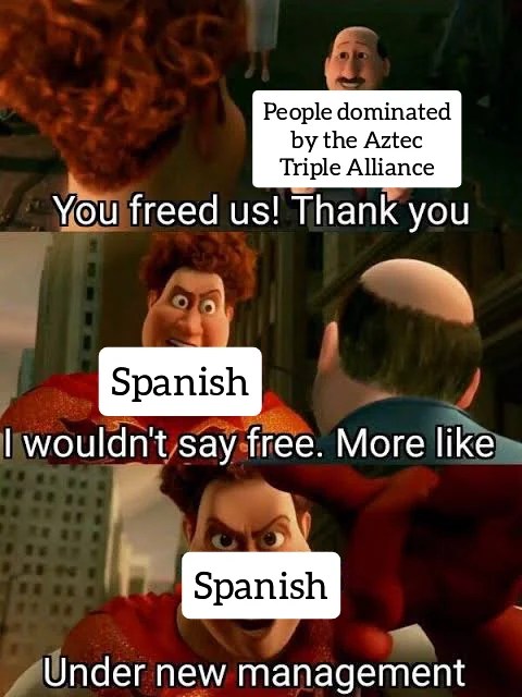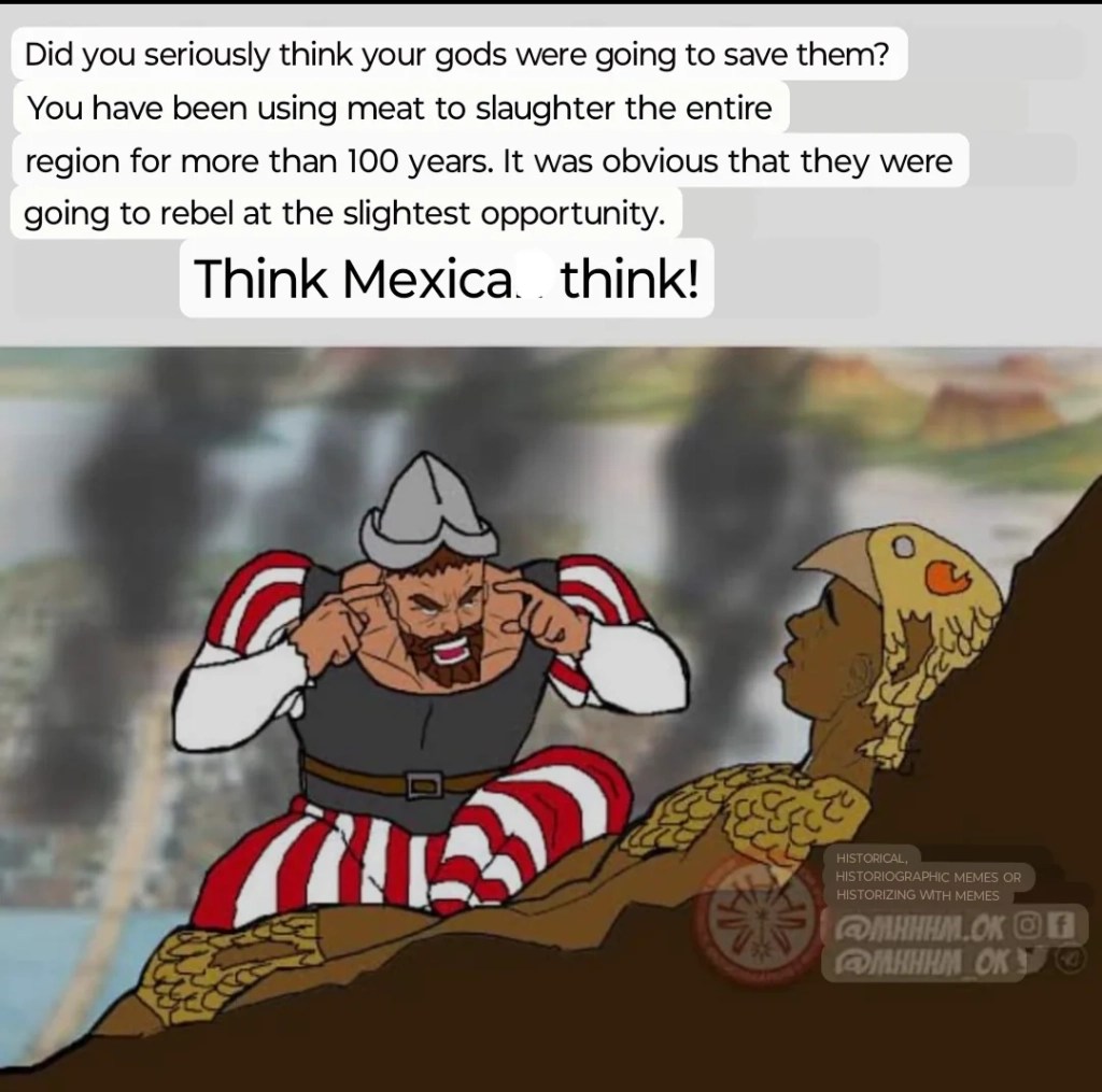 Yes but…you helped the invasive culture of Quetzalcoatl spread (I’m assuming this references the myth that Cortés was the reincarnation of Quetzalcoatl returning)