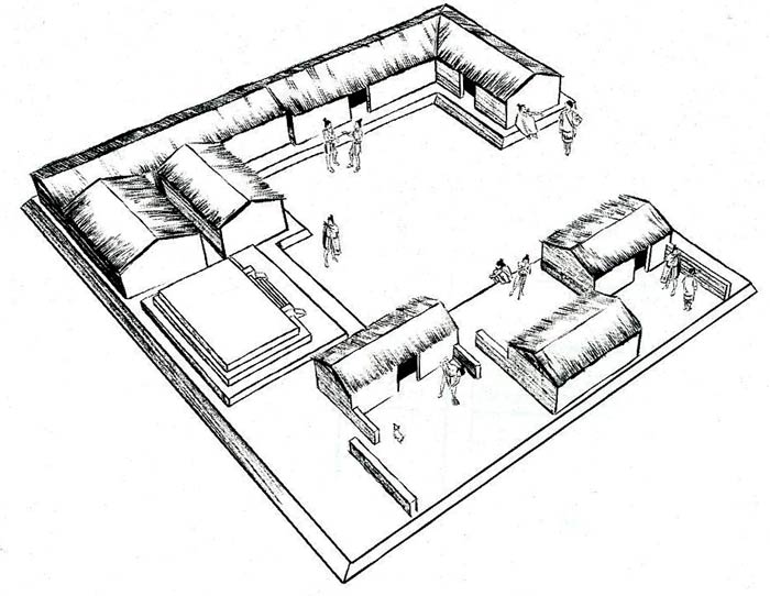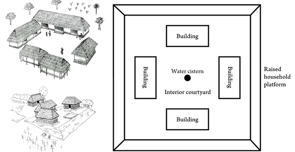 In Tenochtitlan the basic collective dwelling was fairly large, approximately 500 m2, containing five or six family dwellings which were one or two stories high each of which opened on to an open space or patio. Each dwelling was formed of one or two rooms with an area between 10 to 30 square meters. A well and collective bathrooms were placed next to the family dwellings.
