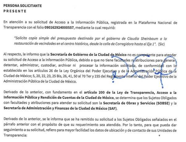 “I request a simple copy of the budget allocated by Claudia Sheinbaum’s government to the restoration of vecindades in the centro historico (the historic centre), from Corregidora Street to Axis 1. Secretary of Government, Secretary of Administration and Finance.”