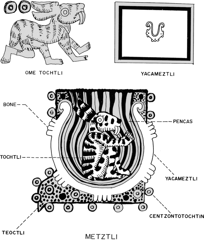 In the Mesoamerican pantheon, the gods who carried yacameztli such as Mayáhuel , Patécatl , Tlazolteolt or the Centzontotochin were associated with the natural forces of creation and fertilization, but also with those of death and regeneration. For more information on these beings see Mayahuel and the Cenzton Totochtin.