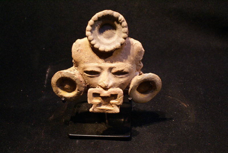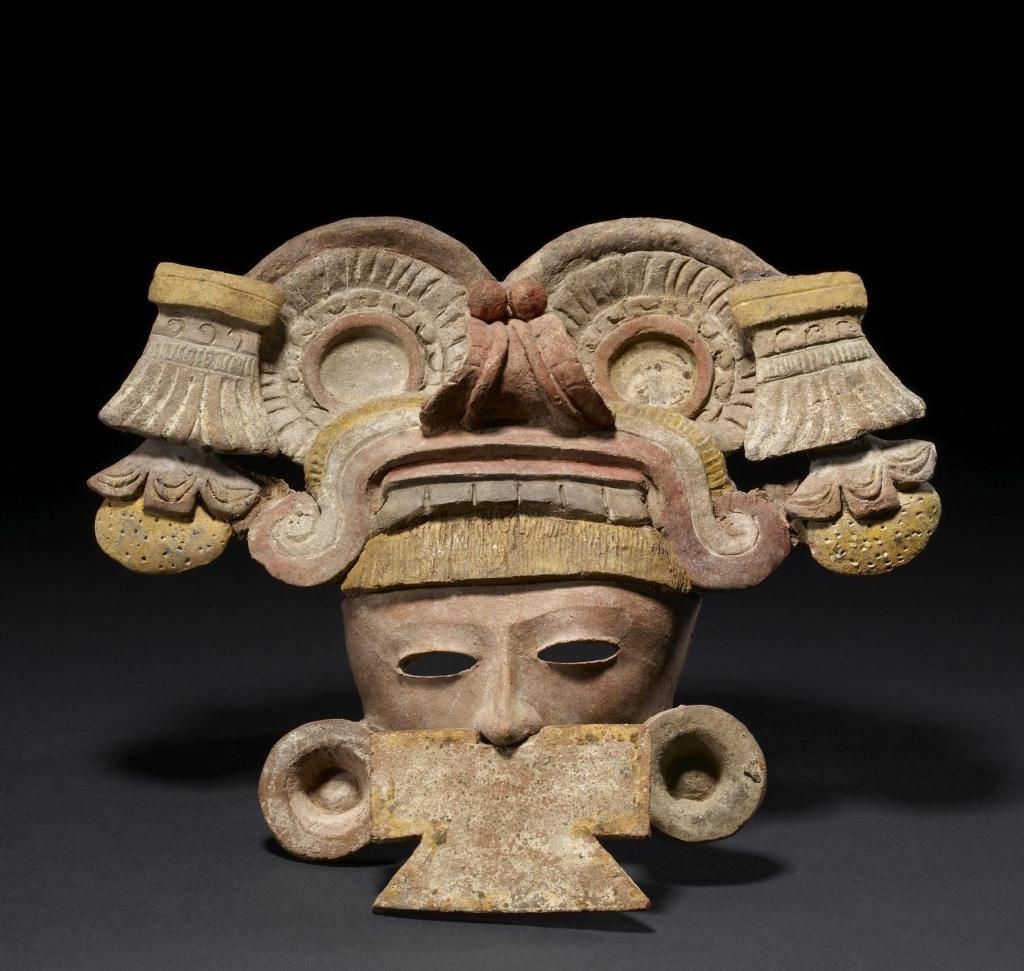 The lack of expression and the standardized features of this mask make it purely Teotihuacan in style. It is unusual, however, in that it is not made of stone, but of baked clay, and also in that it includes other elements commonly found in painted depictions of masks but not in actual masks found so far, to wit: the “butterfly” nosepiece motif and the disc ear flares. Nosepieces as emblems of power have a long history in Mesoamerica