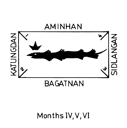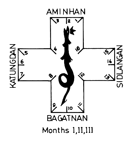 In the first phase (January, February and March), the Bakunawa’s mouth is in the north and its tail in the south. One must avoid building a house in the direction of the mouth or bad luck will befall their home. A house built in January is called Balay nga Palamugnan. Those who live here will experience a bountiful harvests. In February, houses are called Balay Sang Mga Abyan and its dweller will have many friends who help them succeed. Houses built in March are called Balay Sang Mga Kaiwaton, Hilu, Kahisa, Kaburingut Kag Hinali Kang Kamatayon (House of hardship, poison, jealousy, hatred and sudden death). In a basic sense this month is the worst of all the months to build a home.
