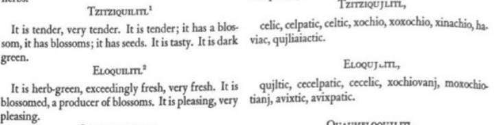 - tzitziquiltic: (Schwaller) scarified; serrated; jagged. This last one is interesting as in the image below (left) Sahaguns work depicts tzitziquilitl as having a serrated/jagged leaf margin. Purslane (Verdolagas) does not have a leaf margin life this. The “leaves” are small, smooth and (in some cases) quite succulent.