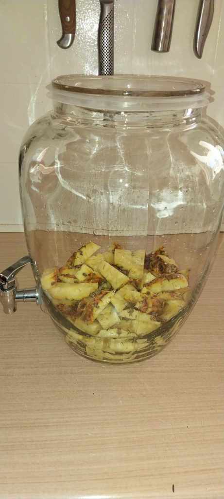 Roughly chop the flesh and add it to a large glass jug/container (or use an earthenware one – which adds its own flavour)