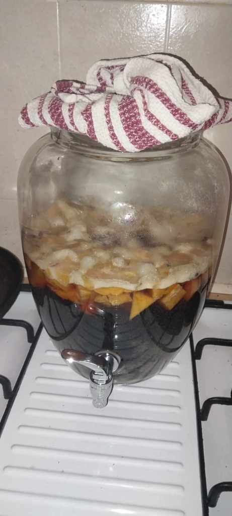 I’ll test the flavour tonight after work. I may need to decant and bottle earlier than I expected. I thought it would take all week. I was actually worried that it might not be ready for the party I plan to take it to on Saturday. This would have given me a six day ferment time and, as is noted in the recipes above, it could possibly have taken 11 days. This was in Soledads recipe though and hers is the only one that recommends it be fermented in the dark (mine is on the kitchen bench – not in direct sunlight but also certainly not in the dark). Diana Kennedys recipe (the first recipe image shown) says to set it in the sun so perhaps there not “proper” way to do it. Diana also has only a 5 day ferment time and adds a can of beer to the mix on day 3. I also not that one of the recipes says to “skim off the foam” that bubbles up (this recipe also has the quickest ferment time noted – 3 days).