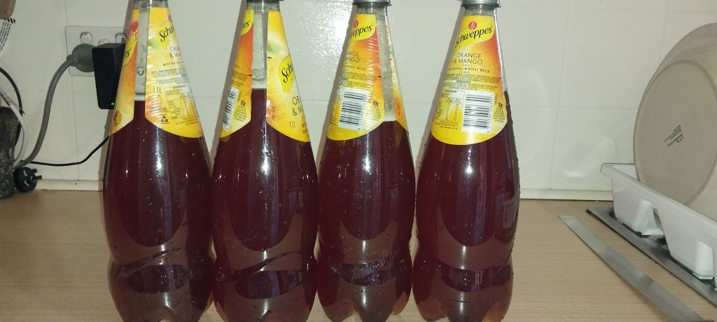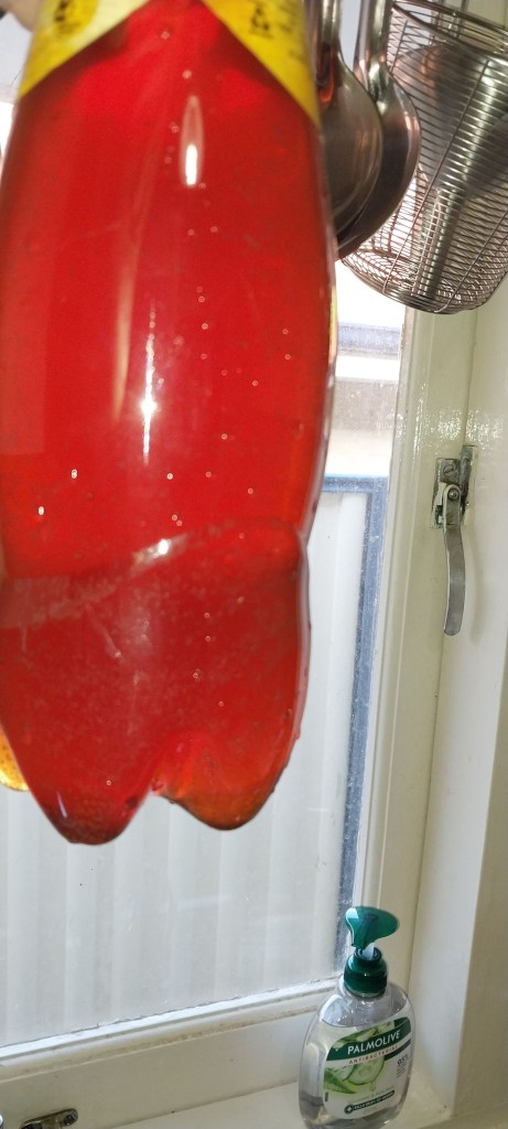 4 x 1.25 litre bottles filled (leaving a space for further fermentation – I’ll “burp” them tomorrow to let out excess pressure/gas
