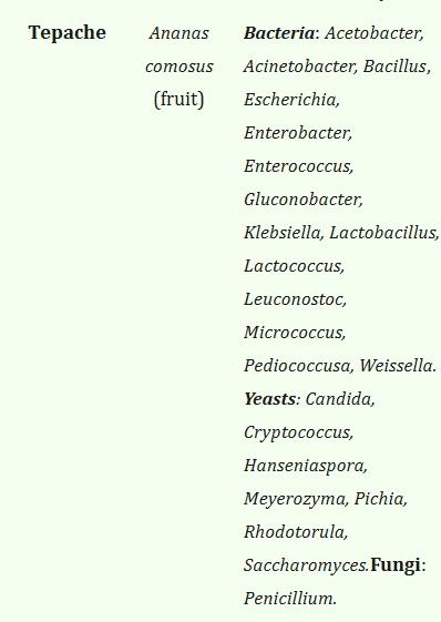 Probiotic content of tepache (now we must remember that tepache is fermented using wild yeasts present in the air and on the skin of the pineapple so other organisms may be present that are not noted on this list – and some of the organisms on this list may not be present in your homebrewed tepache. The list is a good indication though)
