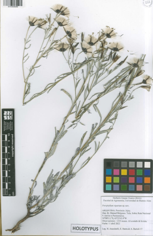 Anzuinelli, Milagros & Schiavinato, Dario & Bartoli, Adriana. (2024). A new species of Porophyllum (Asteraceae: Tageteae) from the northwest of Argentina, and the first record of female plants of Porophyllum cabrerae. Phytotaxa. 660. 65-74. 10.11646/phytotaxa.660.1.6.