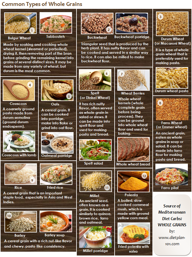 - Whole grains – oats, barley, rye, wheat (whole wheat bread, pasta, including semolina and couscous), rice, millet, buckwheat