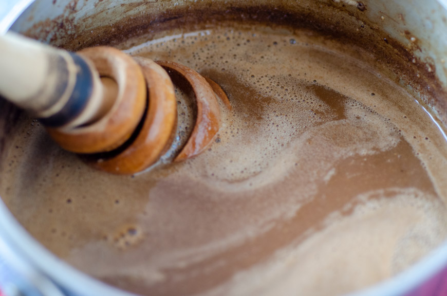 - Once the masa has dissolved, add it little by little to the pot with the piloncillo and chocolate. Stir constantly so that it doesn’t stick to the pot