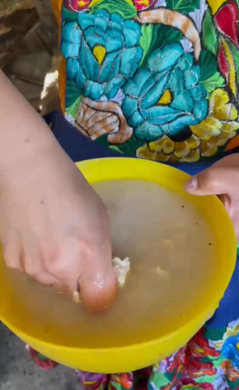 ari_trinidad6 makes a no-cook atole de tortilla in the simplest of ways. Dry your tortilla on the comal. Don’t toast or colour it too much. Fold the tortilla up and add it to a bowl of hot water (as hot as you can manage). Mush the tortilla into a paste. Most of this will remain in the bowl. The mooshing of the tortilla will flavour the water. Drink.