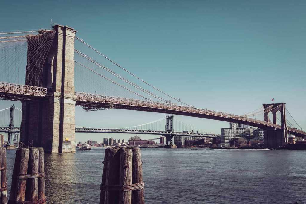 The Brooklyn Bridge, a suspension bridge completed in 1883, spans the East River between Manhattan and Brooklyn in New York City. Its vertical clearance of 127 feet (39 m) (1) and busy traffic make navigation difficult for tall vessels.