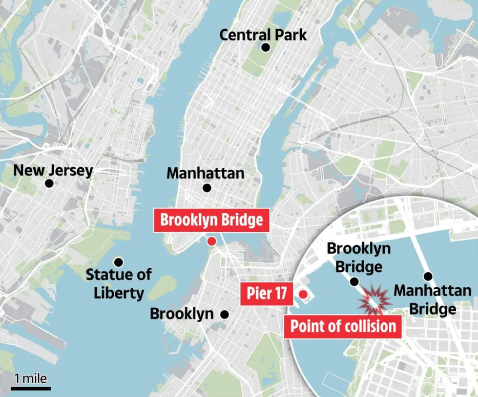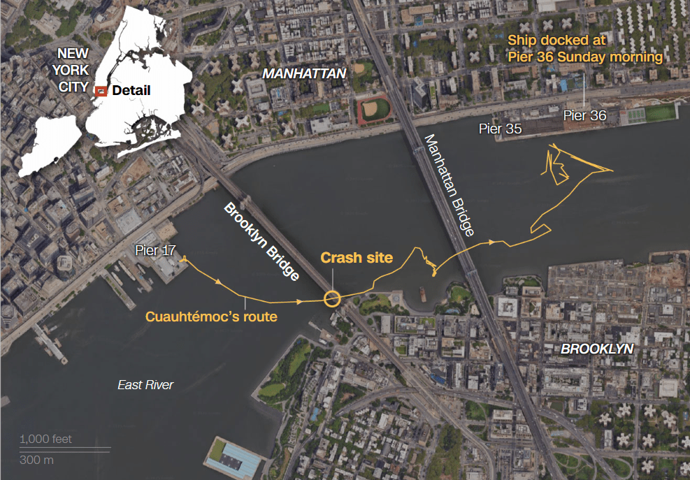 At approximately 8:26 p.m. on May 17 2025, the A.R.M. Cuauhtémoc was setting sail, under the control of a New York Port pilot (as required by Port regulations), having previously left from South Street Seaport.